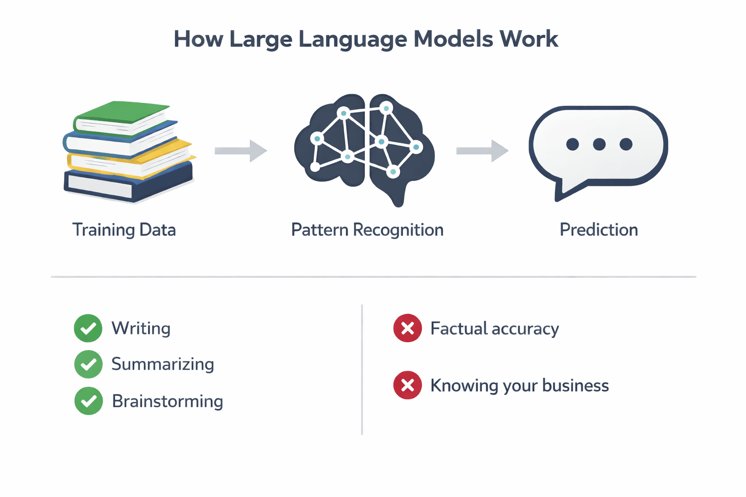 These models were trained on public information from the internet. They have general knowledge about hardware stores and farm supply, certainly. But they've never seen your sales, your inventory, or your customers. Ask ChatGPT which SKUs you should reorder and it will provide an answer—but it's inventing that answer. It has no knowledge of what you sell.