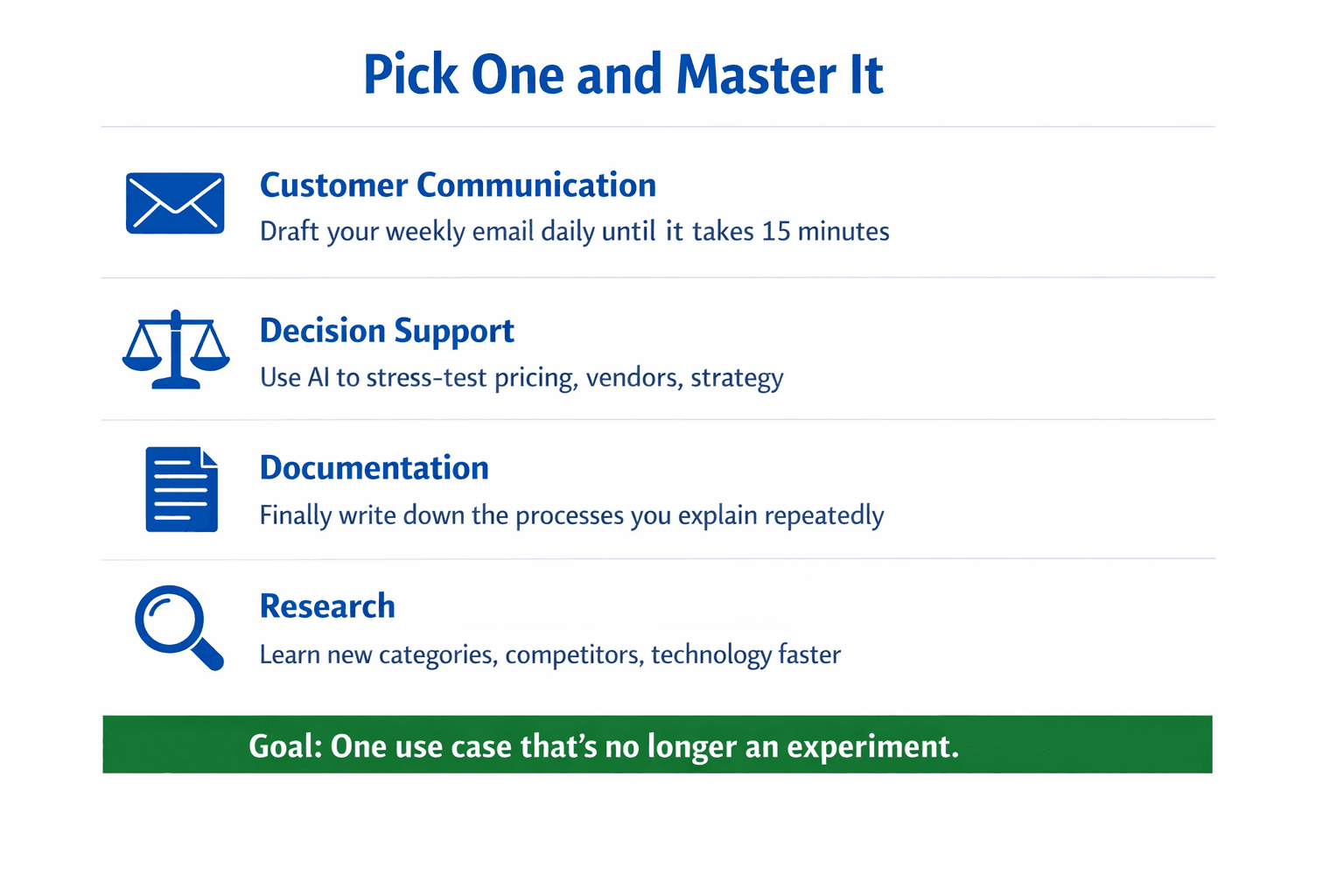 You've experimented broadly. Now select one use case and develop real proficiency.
