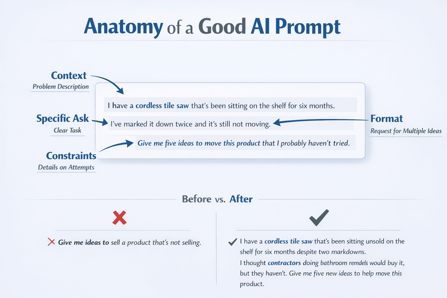 Being too vague. "Help me with marketing" produces generic content. "Write a 60-word email to my contractor customers announcing we now stock Marshalltown trowels" produces something usable.